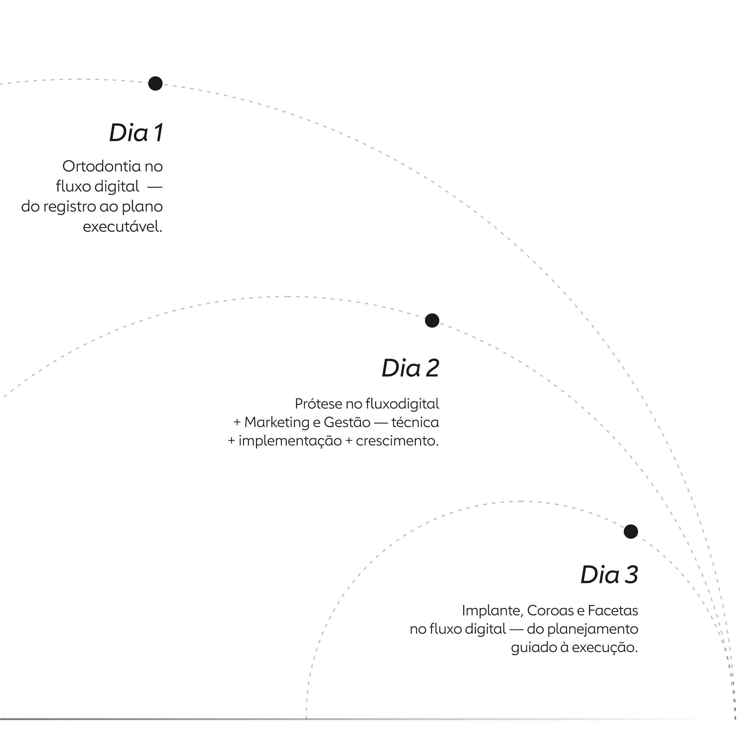 Em 3 dias, você aprende a implantar ou aprimorar o fluxo digital com método didátido e prático para começar a aplicar o quanto antes no seu consultório.